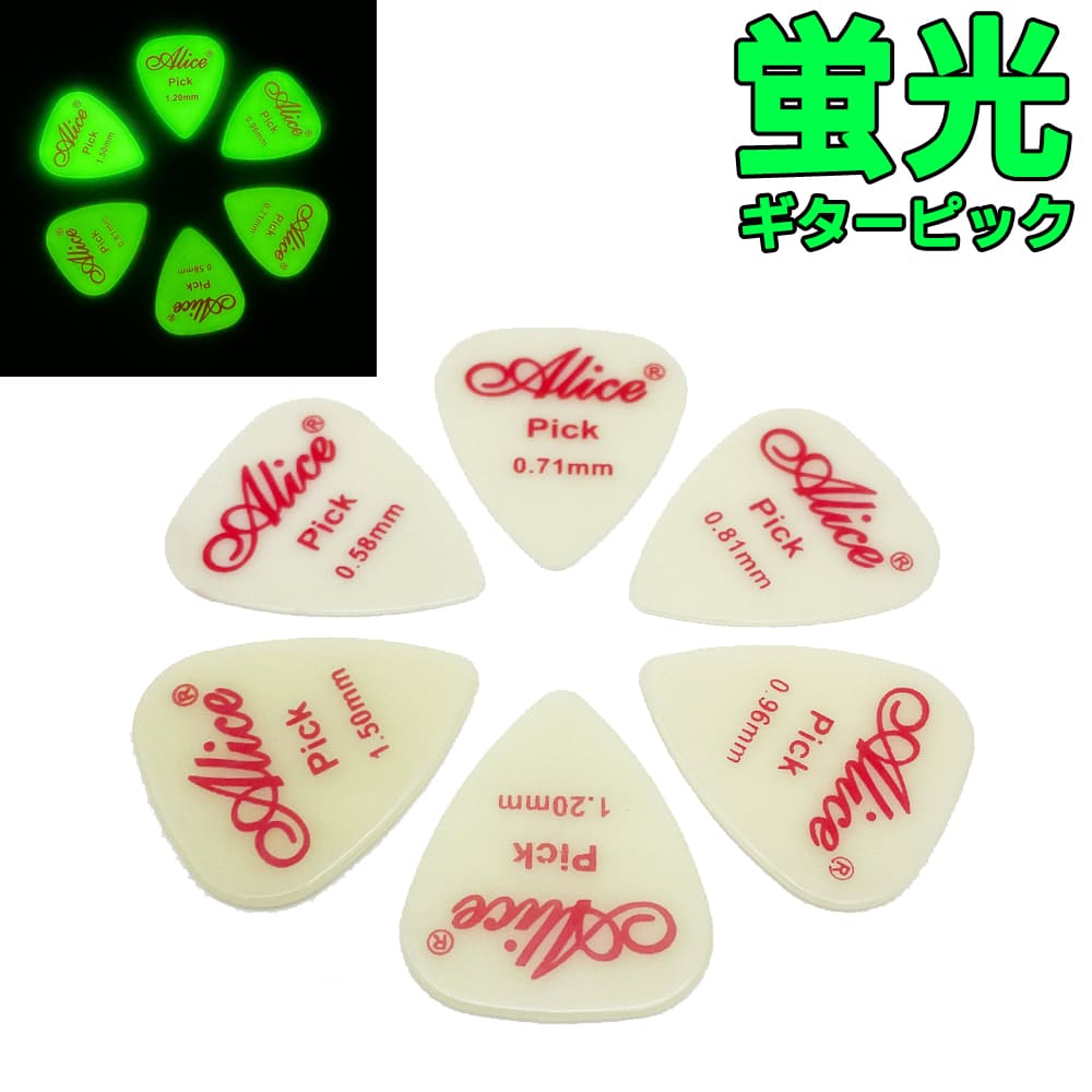 蛍光ギターピック 6枚セット 0.96mm Alice 蓄光 暗闇で光る ティアドロップ 初心者 アコギ エレキギター ウクレレ メール便なら送料無料 1mm