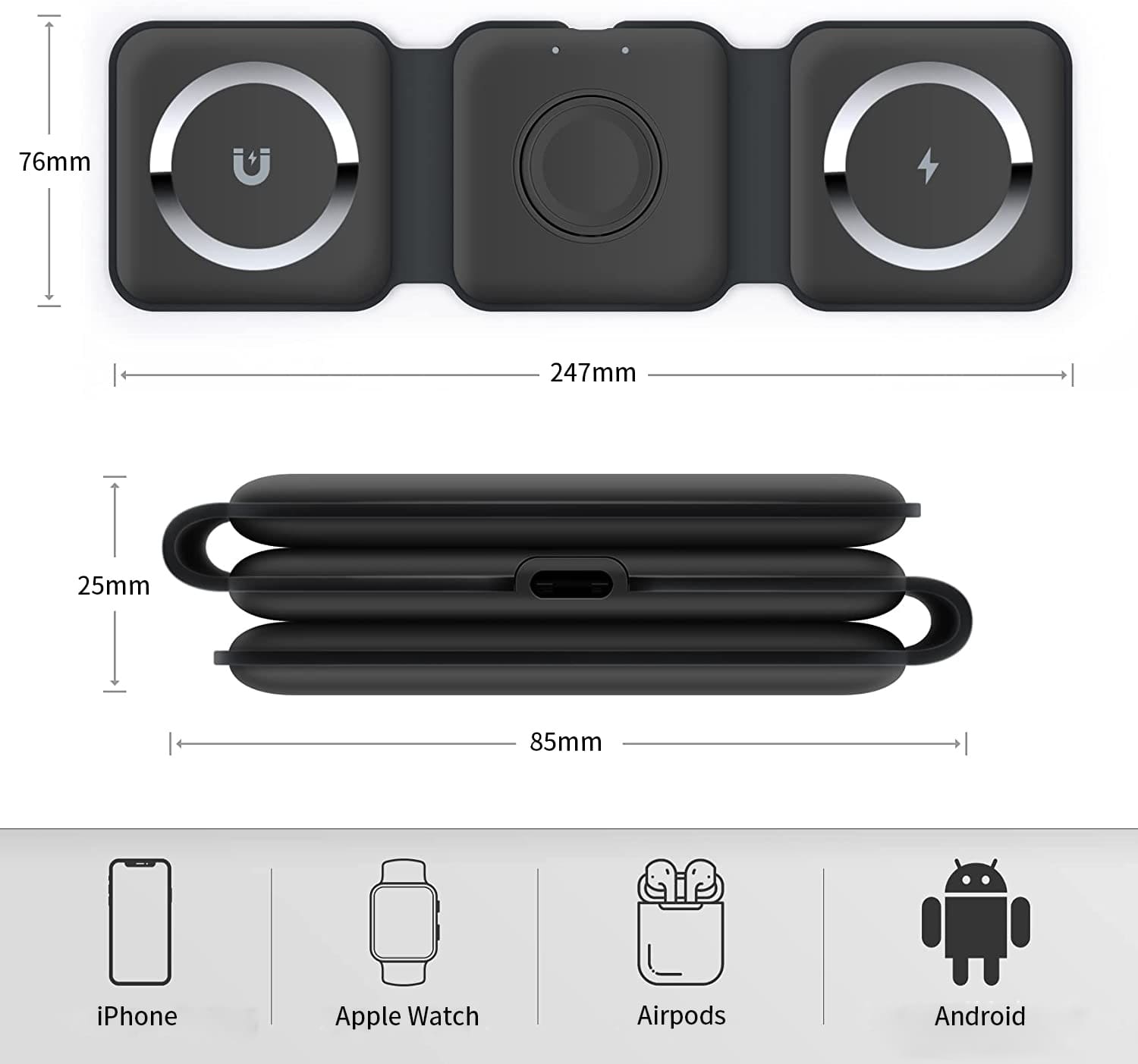 iPhone, Apple Watch, AirPodsやワイヤレス充電対応のAndroid端末が同時に3台充電可能なワイヤレス充電器です。