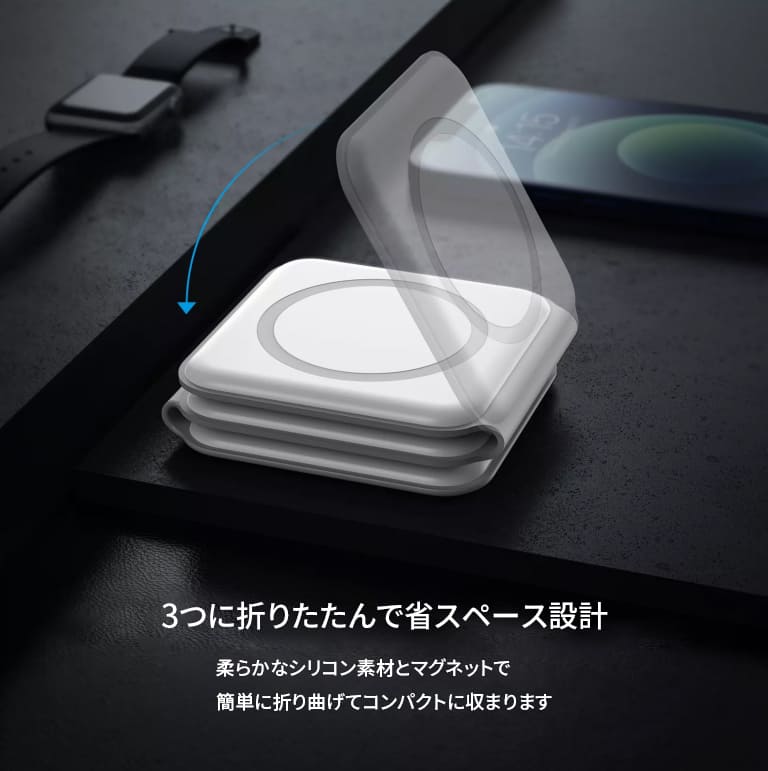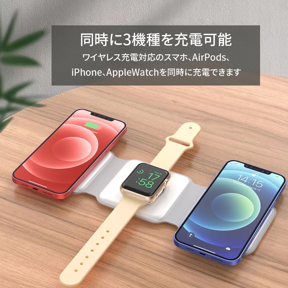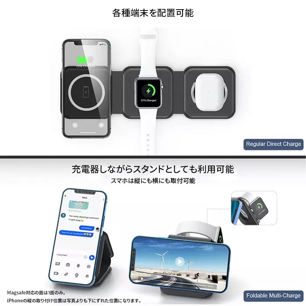 iPhone15 折りたたみ 3in1 マグネット式ワイヤレス充電器 Airpods充電器 AppleWatch充電器 スマホスタンド 磁気吸着 15W急速充電 アイフォン14 13 12 Pro Max Mini Plus コンパクト