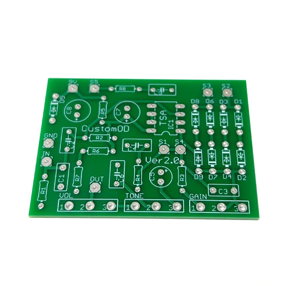 各部品を入れ替えて音色をカスタマイズすることを前提とした、当社オリジナルのカスタムオーバードライブ自作用基板です。