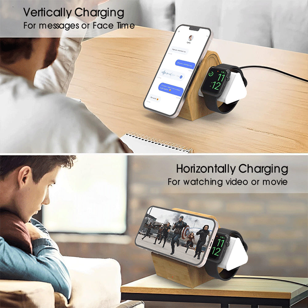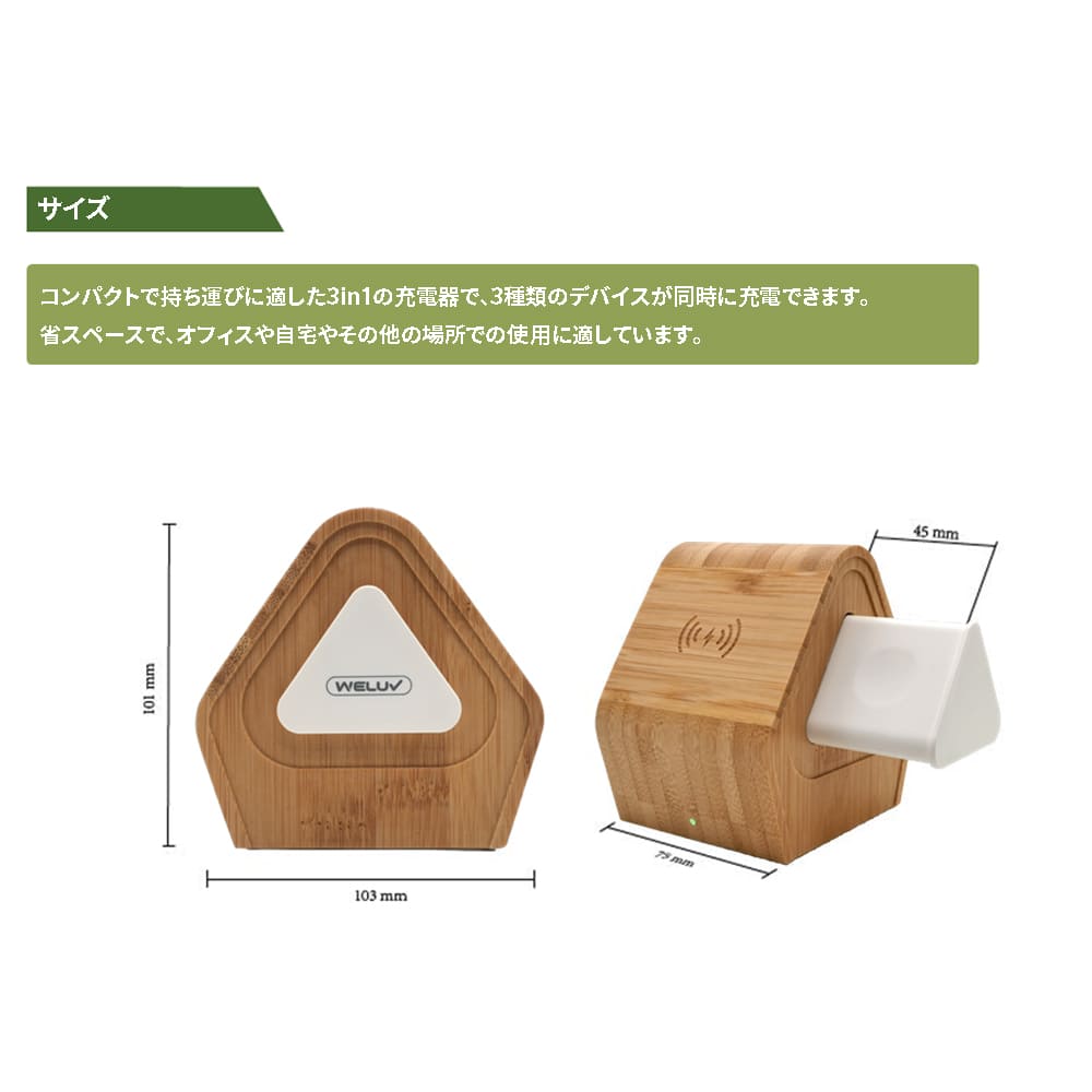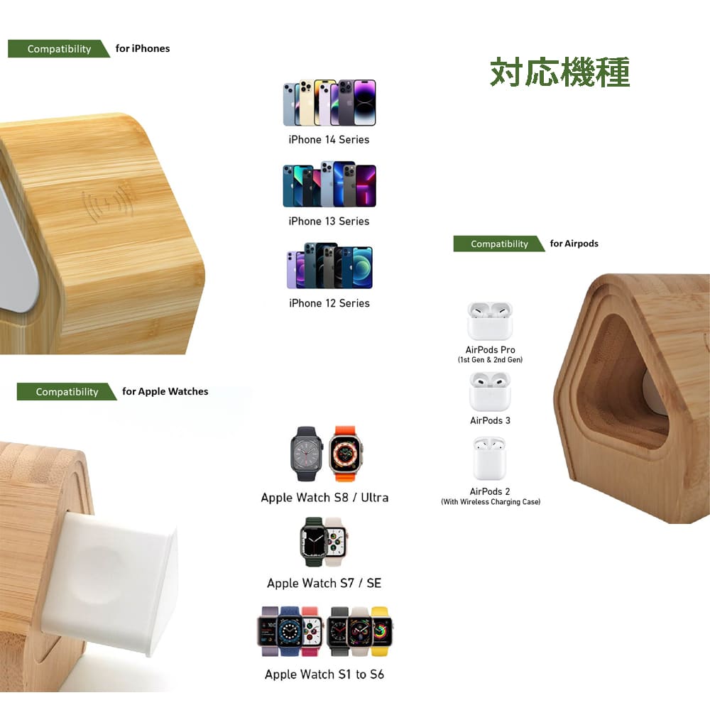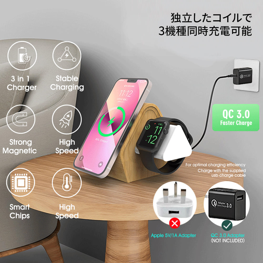 ワイヤレス充電スタンド 3in1 15W 竹製 iPhone Watch Airpods 同時3機種充電 無線充電 卓上 配信 iPhone15 iPhone14 13 12 コンパクト Magsafe